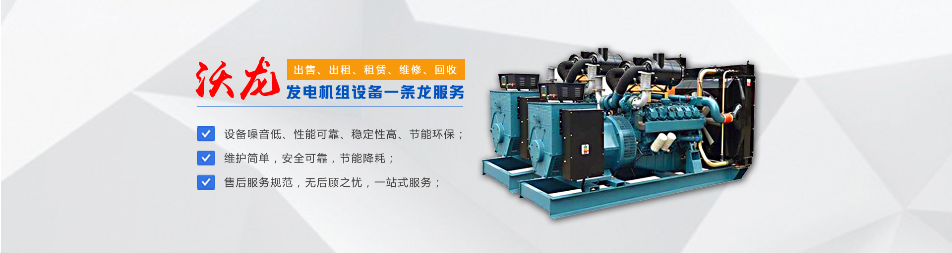 公司主要經營30-1000KW進口國產發電機組的出售、出租、租賃、維修、回收,擁有135等各種柴油機配件,修理大、中、小各種發電機。能隨時為廣大客戶提供各種進口及國產品牌發電機組。配備專業司機和維修維護人員,專業的服務、先進的設備,現場使用零故障。本公司發電機組具備以下特點:噪音低、性能可靠、穩定性高、節能環保。我們可以滿足用戶長短期用電;面向建筑工地、公路建設、地鐵施工、野外作業、商場備用、醫院應急、影視媒體、單位供暖等多家企事業單位提供租賃業務。